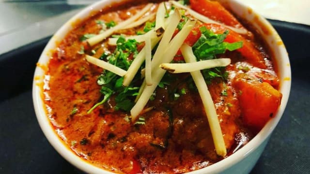 Lamvlees bereid in een speciale Indiase saus met uien..