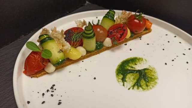 Bis di tartare di scampi e branzino, sashimi di salmone marinato. / Arrosticini di pecora/ Tagliere di salumi e formaggi nostrani con marmellata home Made/ Scamorza affumicata con concassè di pomodorini e pesto di rucola