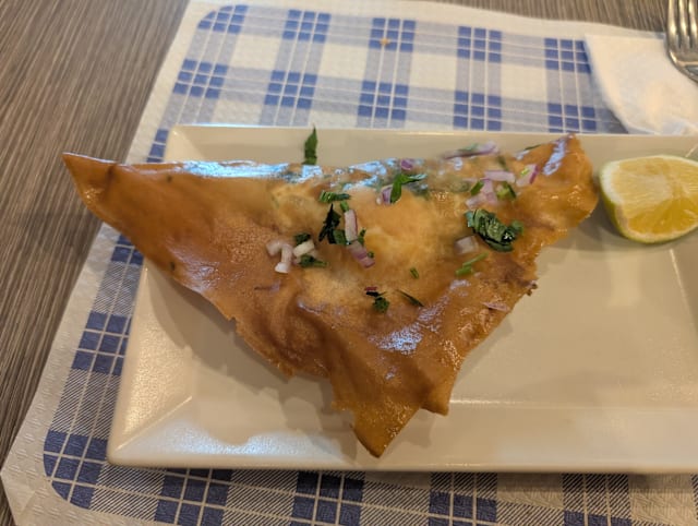 Pasta fillo fritta farcita all'interno con patate lesse uova tonno e prezzemolo riferire il grado di piccantezza