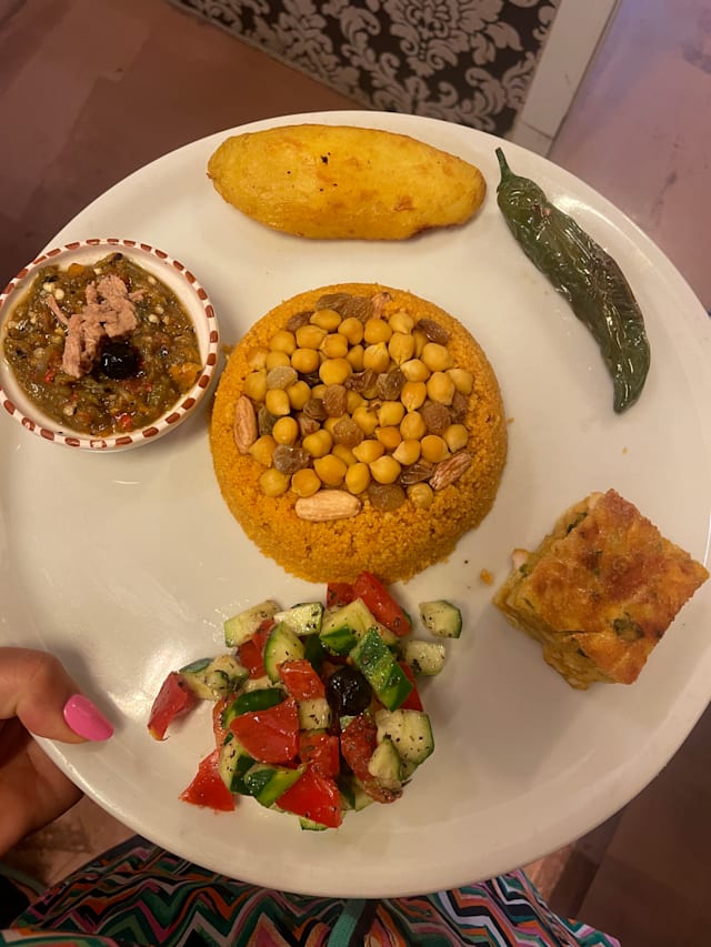 Tipico piatto di semola, condito con pesce i,ceci peperone dolce e uvetta