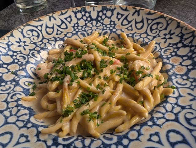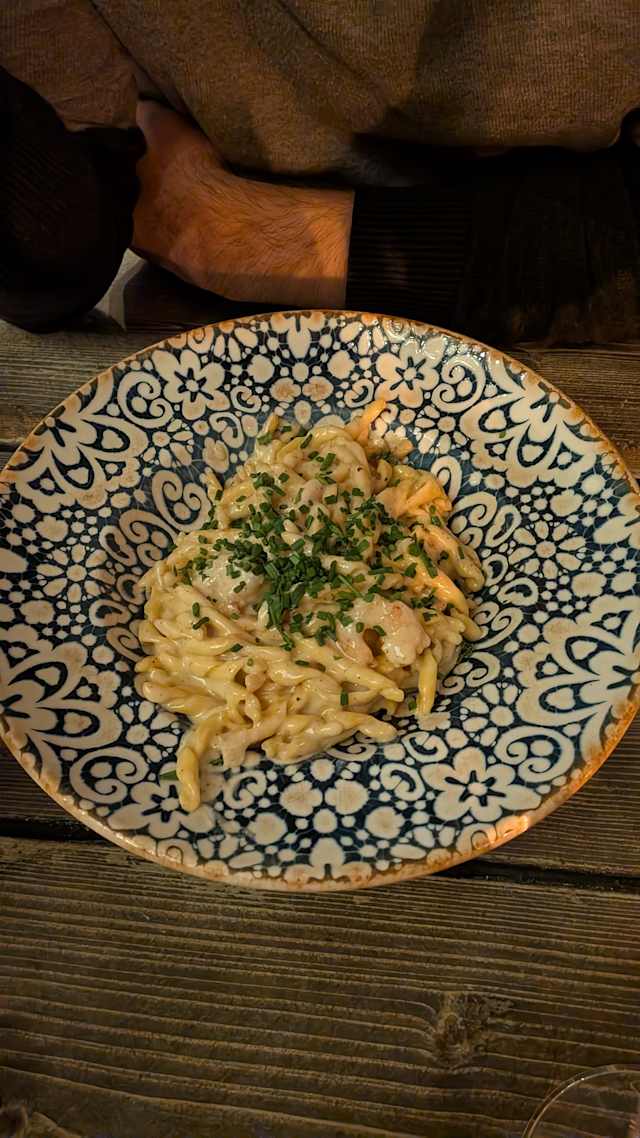 5.5/10The food wasn’t very good. My pasta had so much crème sauce it could have been rightly called soup. The flavor was nice, but I only ate about 10% of my dish. Nobody asked why. My friends pizza tasted good, but was soggy and undercooked. The bread and cheese plate were good, but the lousy entrees made the meal expensive. The staff was friendly, but disinterested.