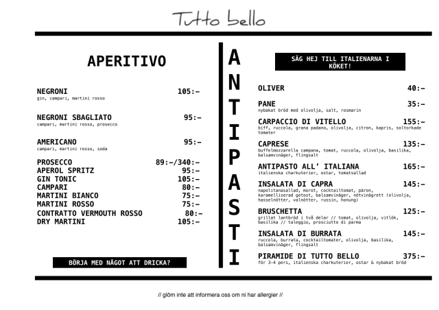 9.5/10Really good food. The portions were amazing specially the Antipasti meals. The only thing that let us down where the drinks, we ordered a Negroni and a limoncello spritz and they felt a bite bland, as if mixed with water.