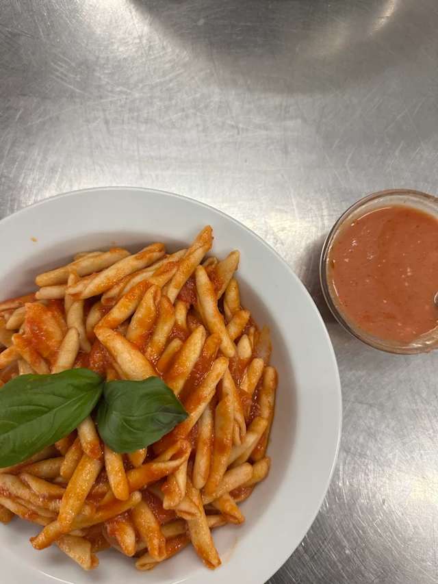 - Orecchiette al sugo di datterino giallo, polvere di capocollo di martina franca, gocce di crema di caciocavallo, basilico.