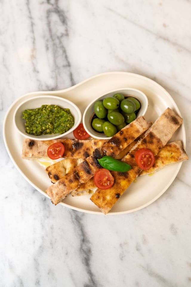 Focaccia caseira de fermentação lenta, servida com azeitonas temperadas, molho pesto e azeite com redução de balsâmico
