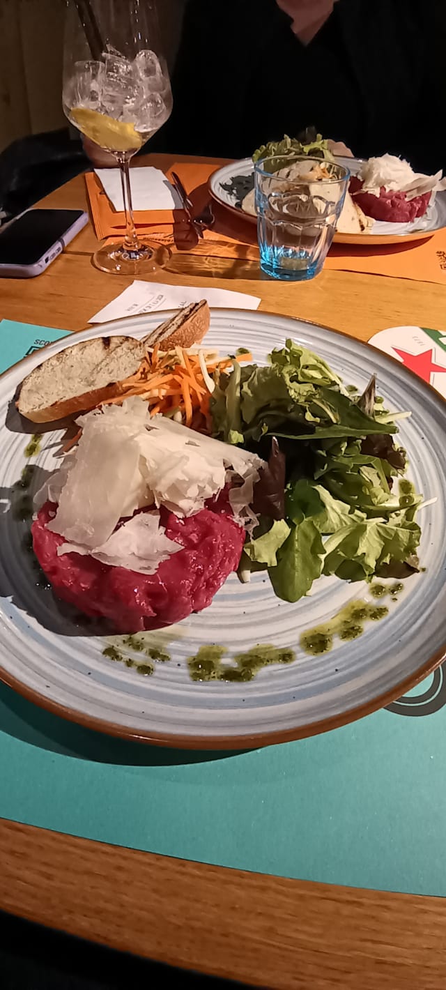 Pane burger nero, tartare di fassona piemontese, salsa honey mustard, ricotta stagionata, olive taggiasche, rucola e capperi. Servito con chips di patate