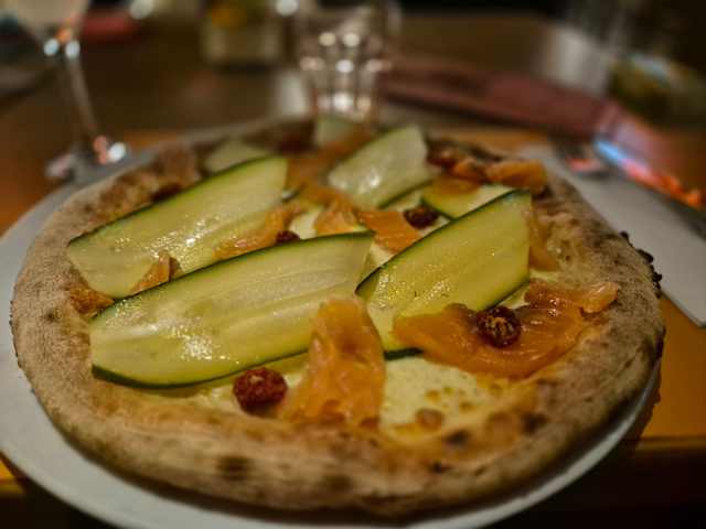 - Mozzarella fior di latte, salmone marinato, zucchine alla citronette, pomodorini confit, mandorle tostate e rucola