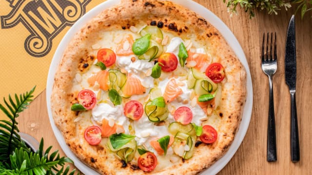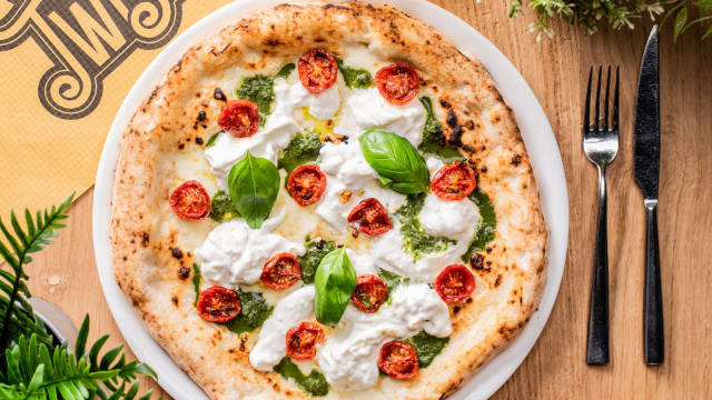 Passata di pomodoro, mozzarella fior di latte, bacon croccante, ricotta stagionata, zeste di lime