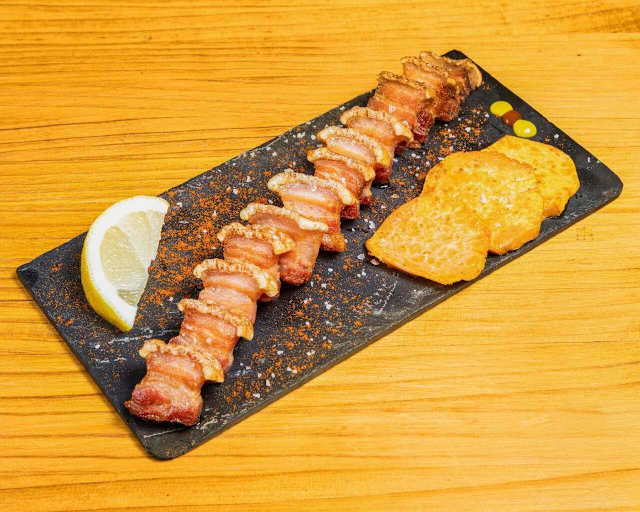 - En salsa BBQ con queso idiazabal, cebolla caramelizada, bacon crujiente y mayonesa