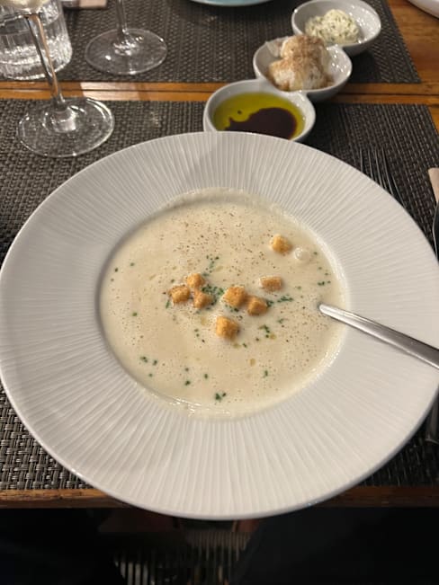 9.5/10We had an early reservation at 6pm so didn’t want 3 courses but the sea bass main was delicious, as was the beef tagliatelle. Steak was very well cooked as were the chips. Childs portion of pasta bolognaise was generous. Staff were attentive and it’s a great location. I would recommend a visit!