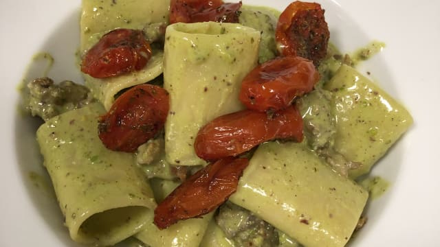 Mezza maniche con pistacchio, stracciatella e guanciale croccante