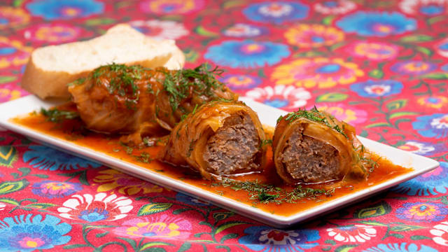2 rollos de carne picada con arroz y especias, envueltos en una hoja de col y bañados en salsa de tomate