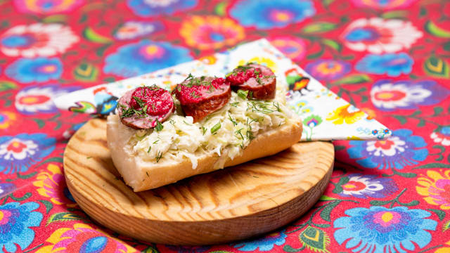 Auténtica salchicha polaca ahumada, hecha a la sartén y acompañada de koleslaw y salsas