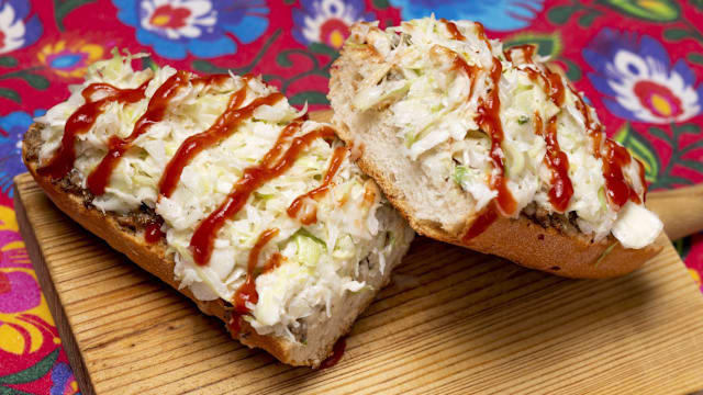 Tosta con champiñones, queso fundido, koleslaw y ketchup