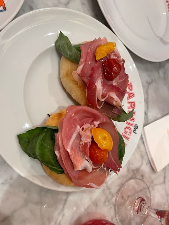 2 Montanarine o 2 bruschette con crudo di parma DOP ponte romano 24 mesi, pomodorini, basilico e olio evo bio sole di cajani.