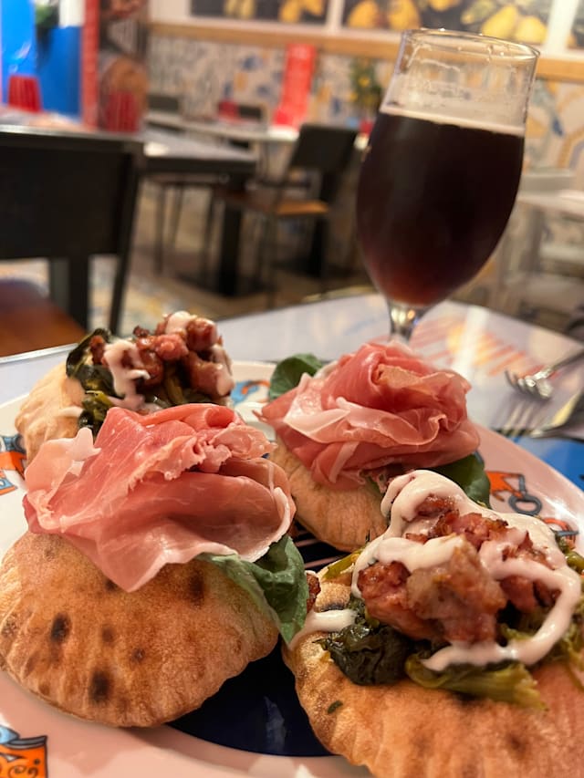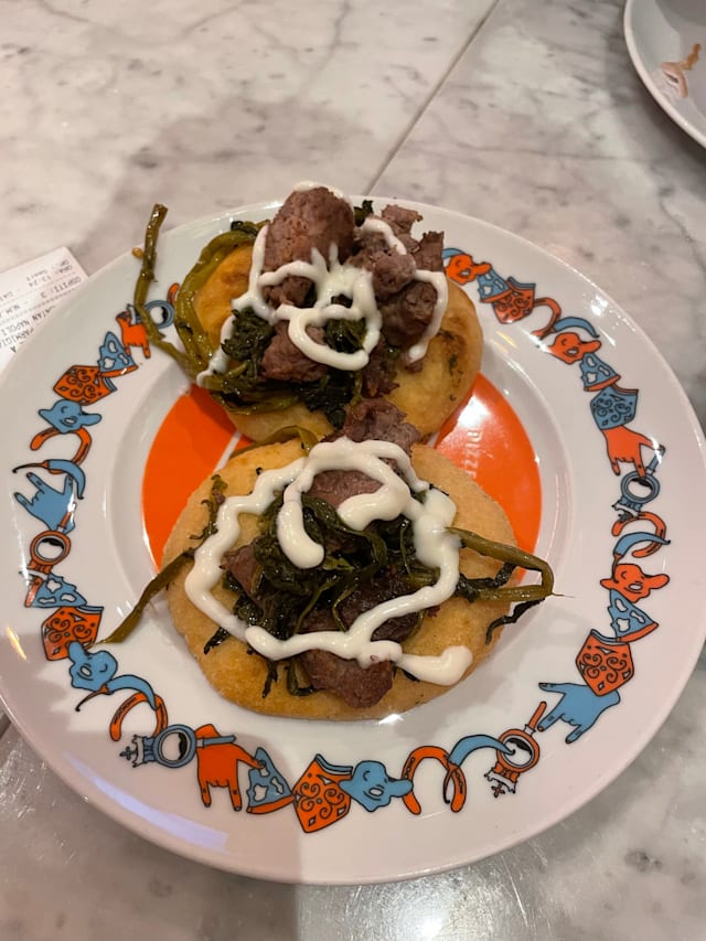 2 Montanarine o 2 bruschette con salsiccia di maialino nero casertano, friariello napoletano casa marrazzo e fonduta di parmigiano.