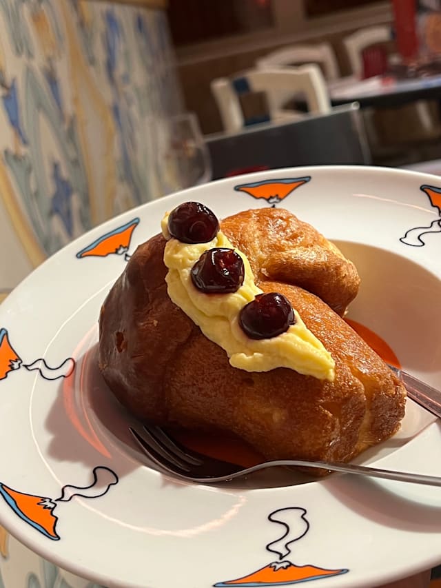 Fiore di zucca in pastella croccante, ripieno con ricotta, sale, pepe, seste di limone sfusato, provola affumicata fior d'agerola e parmigiano reggiano DOP 24 mesi