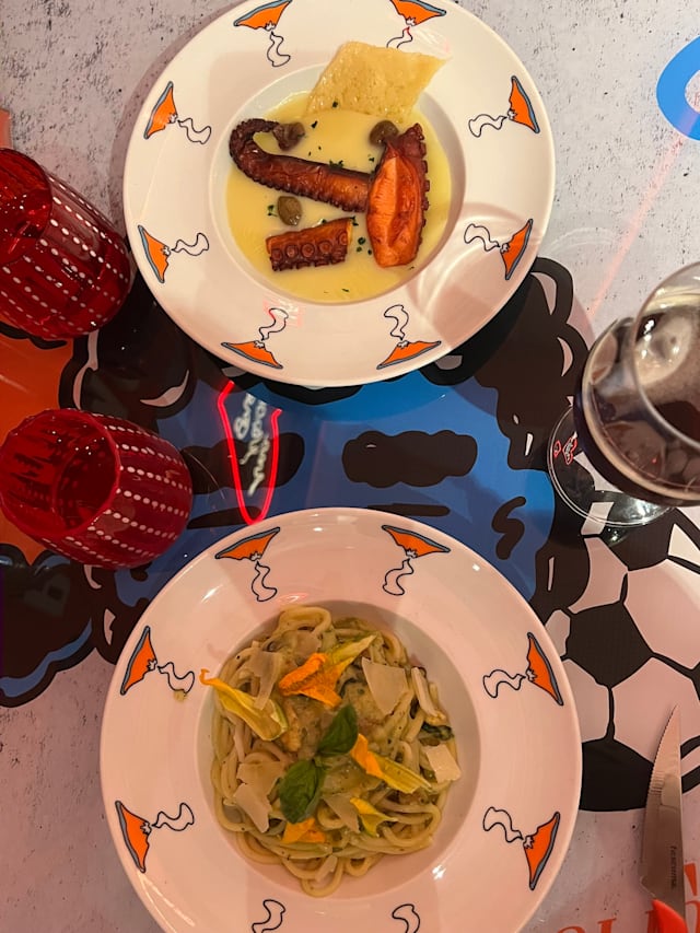 Polpo al forno su crema di patate con parmigiano reggiano e olive taggiasche.