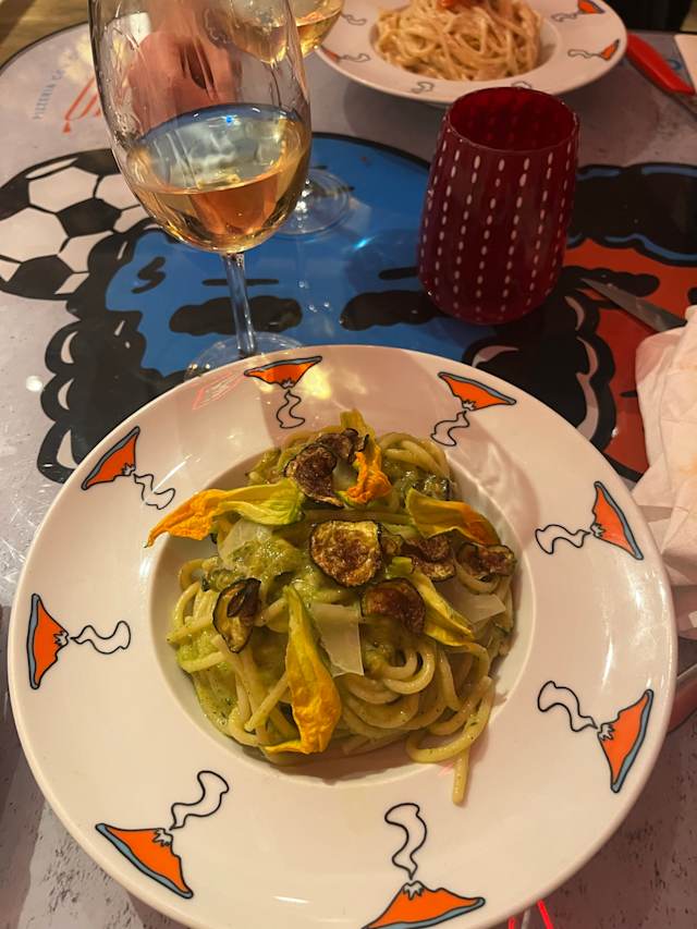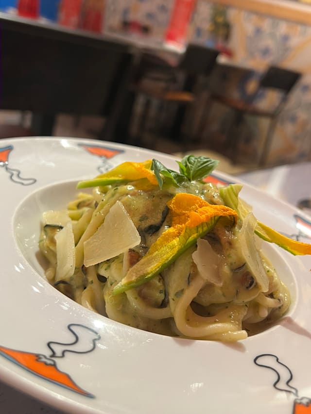 Vermicelloni di gragnano IGP pastificio di martino, crema di zucchine mantecata con parmigiano reggiano provola affumica di agerola, chips di zucchine e olio evo bio. in uscita juliene di provolone del monaco, basilico e fiore di zucca.