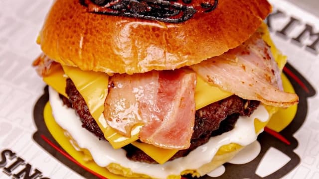 Pão brioche, 2 carnes de 80 g, 3 fatias de queijo cheddar, 2 fatias de bacon e molho especial.