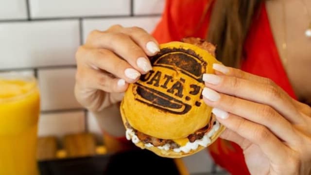 Pão brioche, blend de 110 g de grão de bico, queijo cheddar, cebola roxa frita ou crua, alface e tomate (opcional).