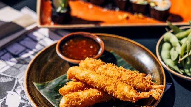 Vegetable tempura, delicious and crunchy breaded zucchini, carrots, red pepper and eggplant adn 2 prawns