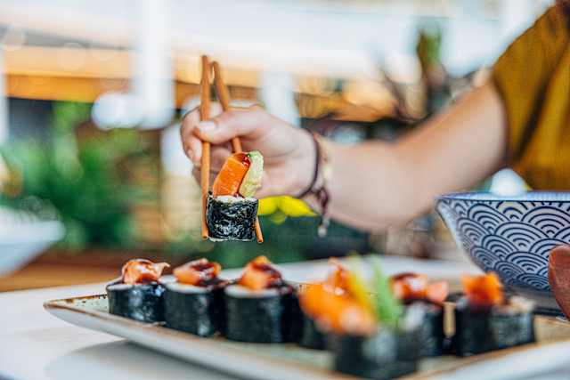 - Ocho noodle rolls con salmón, aguacate, mango, queso suave y salsa terlyaki