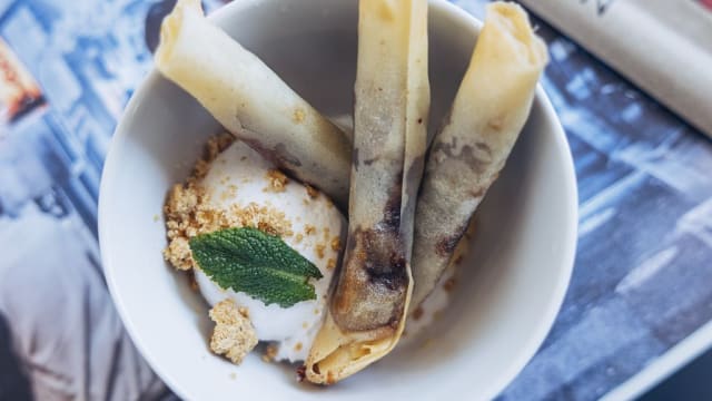 Ocho noodle rolls calientes en tempura con aguacate, queso suave, semillas de sésamo, cebollino y tartar de salmón con salsa teriyaki