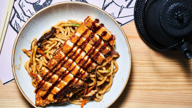 Salteados con setas shiitake, zanahoria, calabacín y pechuga de proteína vegetal heura rebozada con panko, salsa yakisoba y cebollino