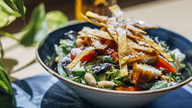 Ensalada verde con aguacate, tomate cherry, pechuga de pollo de corral rebozado con maíz tostado, salsa césar con dashi, chips crujientes de maíz, cacahuetes y parmesano rallado