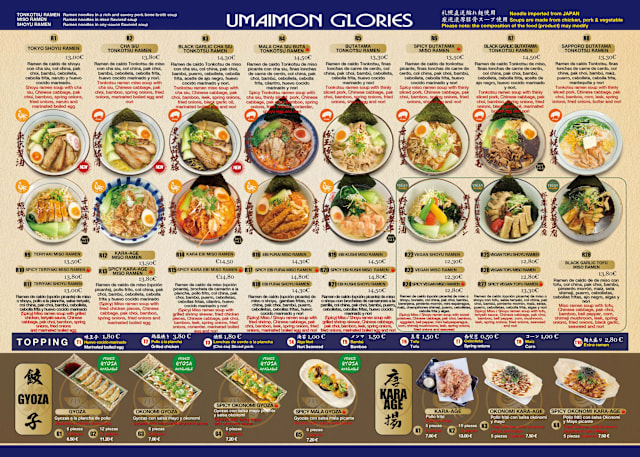Ramen de caldo (opción picante) de miso o shoyu, boniato, col china, pak choi, bambú, berenjena, pimiento morrón, mini espárragos, maíz, champiñones shimeji, puerro, cebolletas, cebolla frita y algas