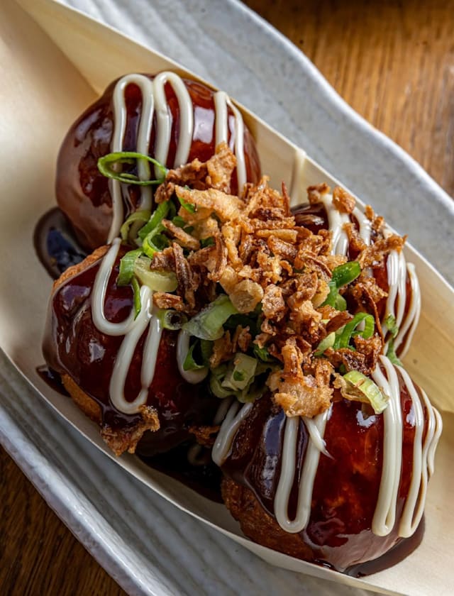 Tofu fritocon mayonesa picante, salsa okonomi, cebolleta y cebolla frita