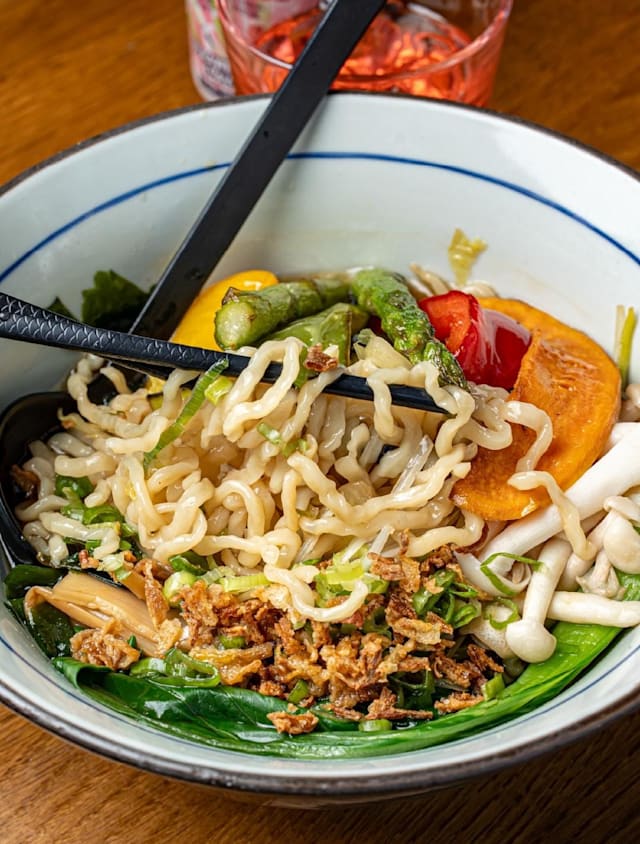 Ramen de caldo (opción picante) de miso o shoyu, boniato, col china, pak choi, bambú, berenjena, pimiento morrón, mini espárragos, maíz, champiñones shimeji, puerro, cebolletas, cebolla frita y algas