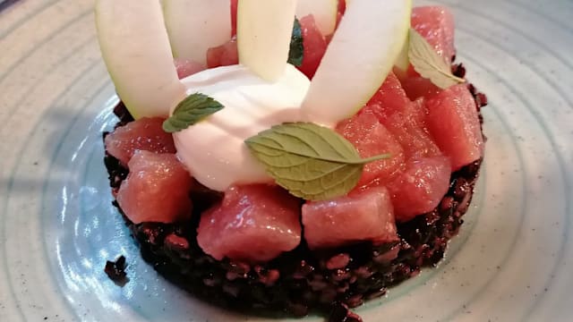 Porchetta di tonno con insalata iceberg, clorofilla di basilico, pomodorino confit e cipolla in agrodolce