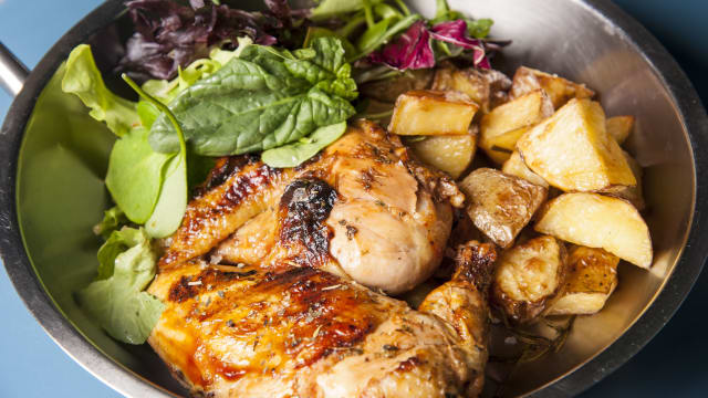 Mezzo pollo ruspante marinato, cotto a bassa temperatura e grigliato con misticanza biologica e verdure