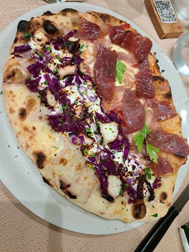- Pomodoro san marzano DOP, mozzarella fior di latte, cipolla rossa di tropea, tonno rosso scottato, prezzemolo, olio evo