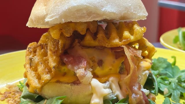 Mezzo pesante fuori standard. Doppia spinta, anima imbottita, componenti extra-large. Doppio hamburger, prosciutto cotto, crocche di patate, salsa yogurt