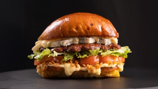 Pane brioche fatto in casa, vegan smashed burger • gorgonzola onion flakes • insalata pomodoro • maionese