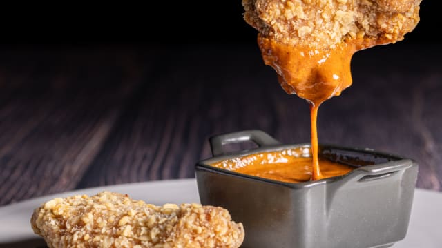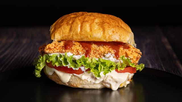 Pane brioche fatto in cas pollo fritto • cheddar uovo all'occhio di bue pomodoro - cipolla spicy nduja sauce