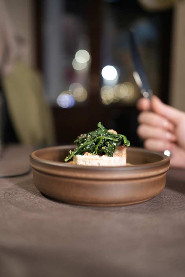 - Uovo in crosta di guanciale con fondente di pecorino e spinacino croccante
