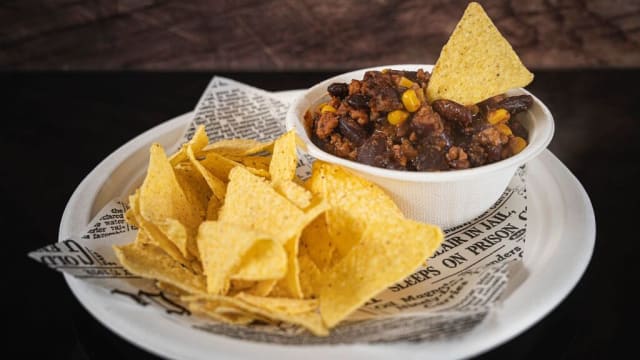 Tortilla ripiena di pulled pork, chili con fagioli e manzo, avocado