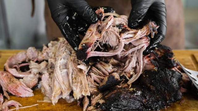Spalla e coppa di maiale cotta ed affumicata lentamente in modo tradizionale con legno di ciliegio, servita sfilacciata