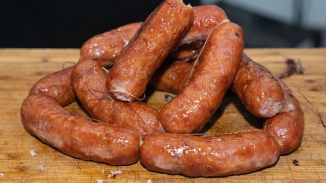 Panino con salsiccia artigianale di suino affumicata con cipolle caramellate e salsa gold (salsa a base di senape fatta da noi)