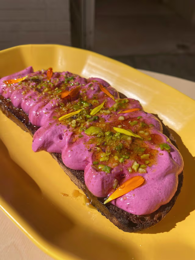 - Pan de centeno con queso crema, aguacate, queso de cabra, miel y pimienta rosa