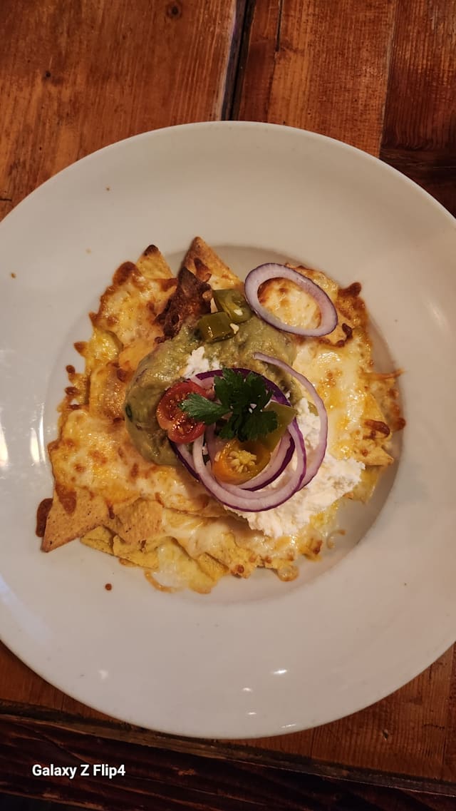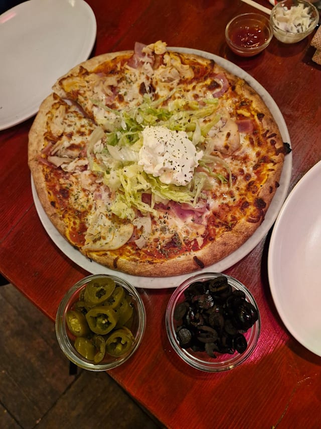 8.5/10It was very nice, exactly how I would expect a pizza to taste. My wife had a tex mex veggie burger. Lots of ingredients on it, which is good, but the texture of the burger itself was squishy and mushy. Lots of different servers, hovering too felt like I was being watched, not a bad thing as 3 people asked if the food was ok. The band played whilst we ate- from 7.30 pm and they were brilliant. Enjoyed listening to them. Overall an enjoyable experience. Would come again.