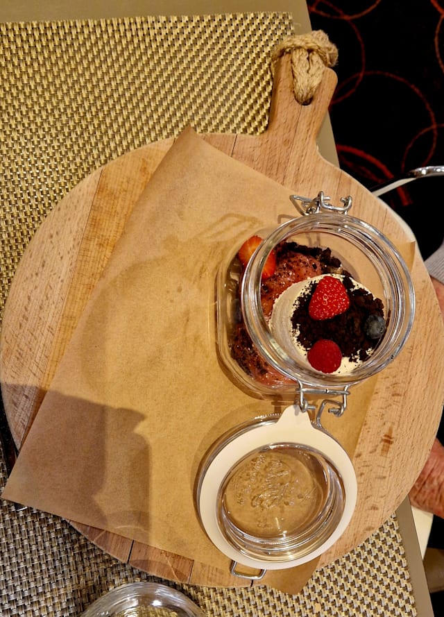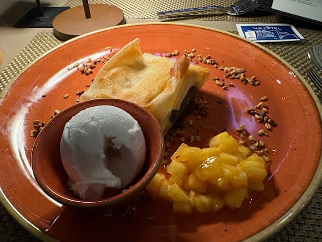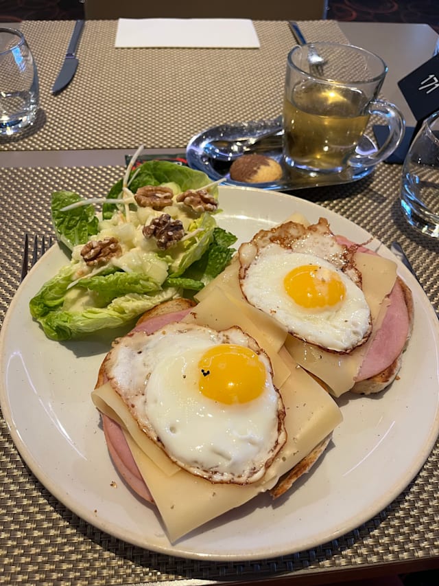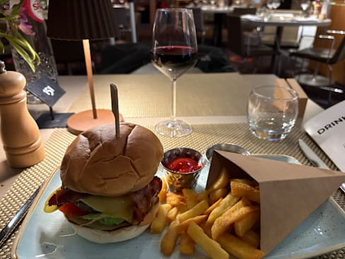 8/10Unfortunately there is only paid parking on the hotel premise. Shouldn't this be free for restaurant guests (?). Found out that there's parking at the end of the entry toad after 7pm (which nobody told when calling). The restaurant is not easy to find as it is in the corner of the Novotel and no signboards. Not even at the entrance inside the restaurant. But attractive modern restaurant with open cooking and we got a nice table. The presentation of the food, especially of the starter menus is very nice, the food is good with acceptable portions. The side dishes and drinks are a bit on the high side. The service was clearly too slow and we had to ask (1 hour from order to main dish, although doup/starter in between).