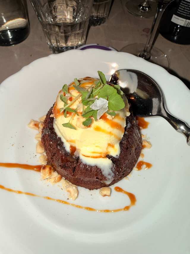 - Chokladfondant med smältande kärna, serveras med kolasås, flingsalt, vaniljglass och hasselnötter.
