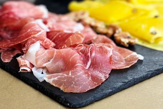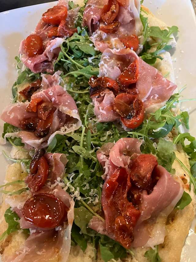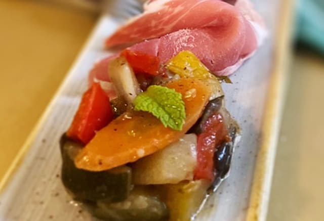Jamon de Parma con friggitelli al horno papas alla paprika e pan negro tostado.
