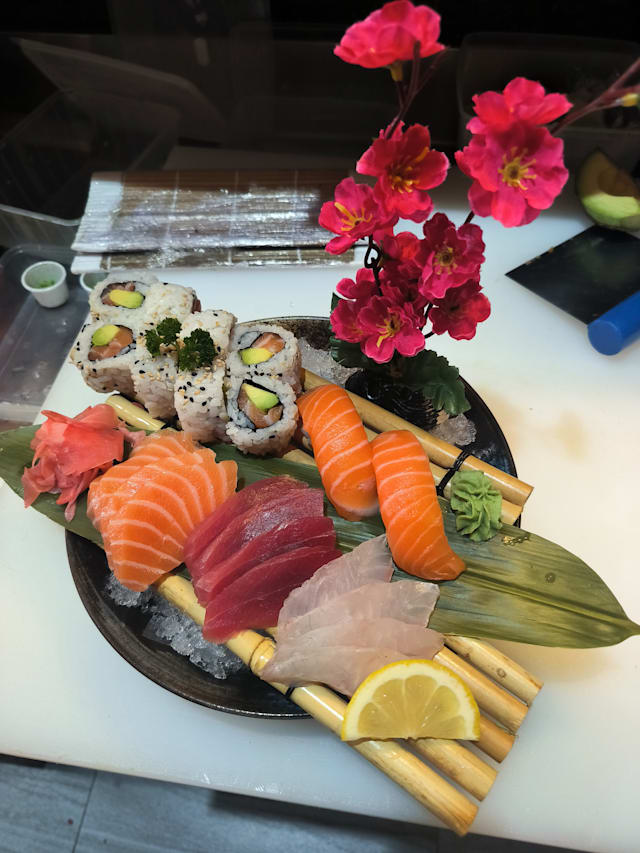 (Rouleaux de riz agrémentés, enroulés tranche de saumon)