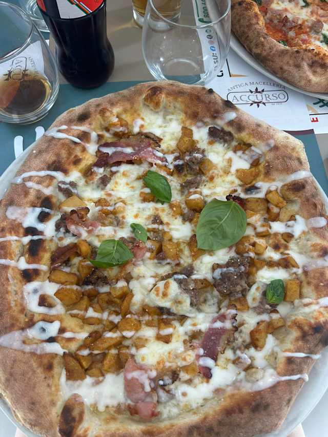 - Provola, patate al forno aromatizzate, pancetta, salsiccia, fonduta di parmigiano