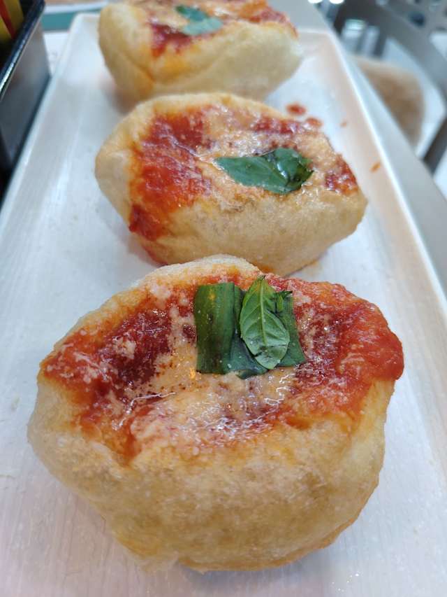 - Sopra: pomodoro s. marzano DOP, basilico, olio EVO Forcitura: fior di latte compano DOP, ricotto di pecora cilentana, salame dolce, pepe nero mocinato, olio evu